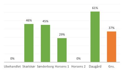 De første resultater viser en gennemsnitlig biomasseforøgelse på 37 % i de parceller, der er behandlet med BlueN, sammenlignet med ubehandlede. Resultaterne varierer fra 0 % til 61 %, og kun én af de fem lokationer viste ingen forskel.
